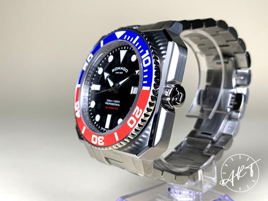 Romago ProAquanaut 300 Blue & Red Bezel Black Dial SS Diver Watch w/ Paper