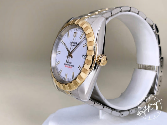 Tudor Classic Date Gold Bezel White Dial 18K Gold & SS Watch 21013 w/ Paper