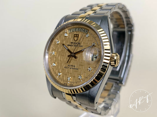 Tudor Prince Day-Date Gold Linen Diamond Dial SS Auto Watch 76213 w/ Paper