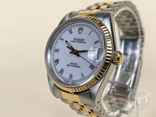 1994 Tudor Prince Date White Roman Dial Gold Plated & SS Watch 72033 w/ Paper