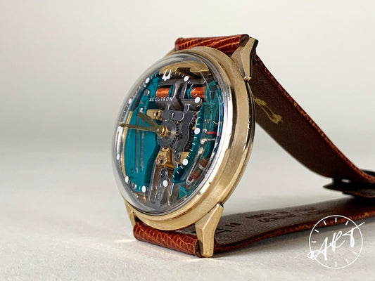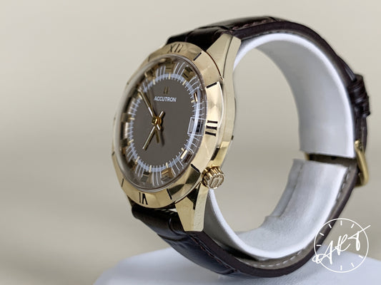 Vintage 1967 Accutron Fancy Bezel Brown Tropical Dial 14K Solid Gold Tuning Fork Watch