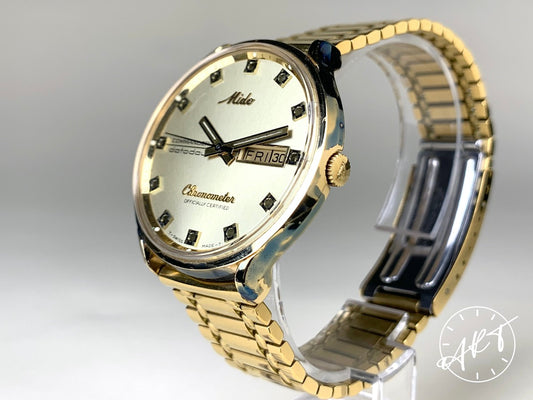 NOS Vintage Mido Commander Datoday Gold Dial Gold Plated SS Auto Watch 8439 BP