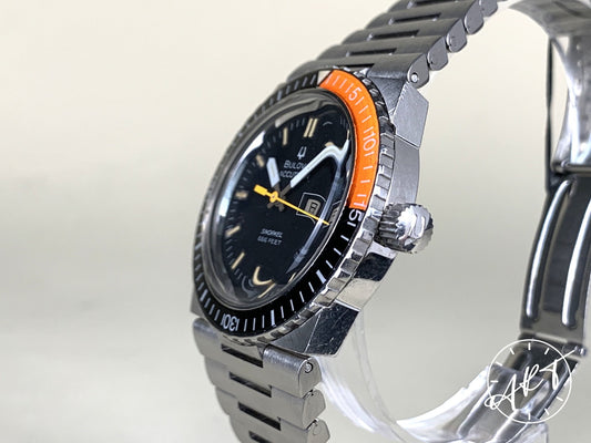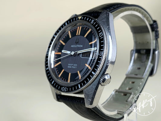Vintage 1968 Accutron Deep Sea 666 Feet Black Dial SS Tuning Fork Watch w/ B&P