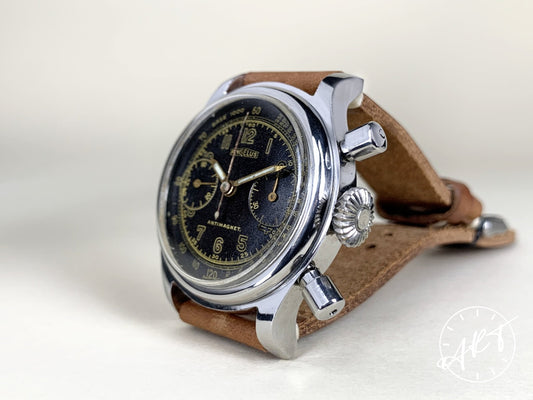 Vintage 1940s Angelus Chronograph Black Gilt Dial SS Manual Military Watch