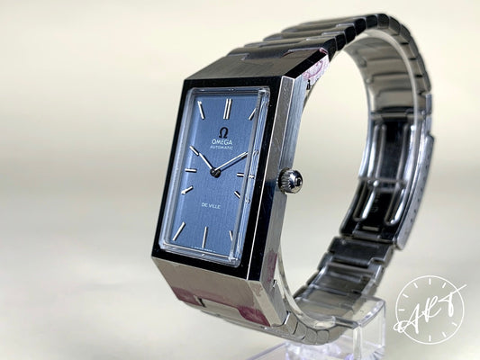 NOS Vintage 1970s Omega De Ville Oversized Blue Dial SS Auto Watch 155.007